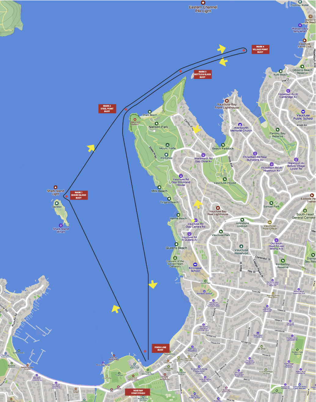 - Proceed FROM Start to Shark Island and turn at Mark 1, Shark Island Buoy located 25m from the White Lighthouse to the North of Shark Island.